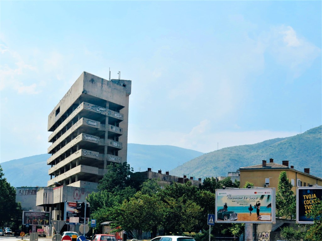 So… we got out of the car, realized it’s 39 degrees Celsius, hid under the nearest tree and put on a suncream (typical tourists, nay?) – great start! Then we walked to our first historically significant stop in the city – the sniper tower. A high building which once was a home to one of the biggest banks in Yugoslavia has throughout history turned into a ruin. However, it served an important purpose as it helped Croats defend their part of Mostar during war in 1990s. When we walked around the building, I was almost afraid, suddenly feeling insecure about its stability. In my vivid imagination, I saw the entire massive construction literally falling right on top of us. So of course, the access to the sniper tower is not allowed – and this time we did not feel adventurous enough to break into the restricted area.