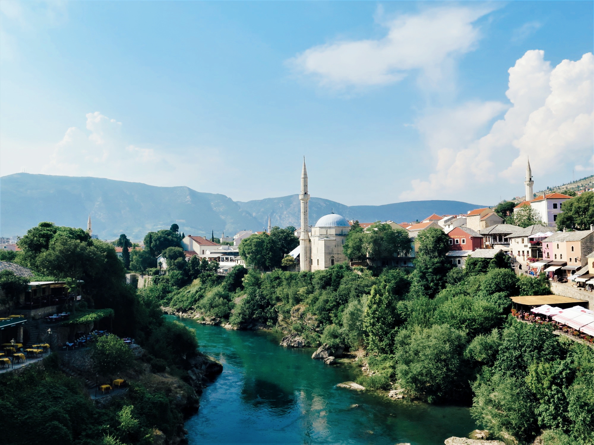 Still, those of you who want to visit the bridge without craving any adrenaline, you’ll probably have the idea of walking there in slippers. For those who really do have that idea, I’ll leave a piece of advice. Don’t do it. The bridge is much steeper than what it looks like in the pictures. And the stones which the bridge is madeup of are all very smooth, which makes the way up (and down, as well) extremely slippery. Not even the little steps help once you don’t have normal shoes on (and I confirm it as I saw a few women fall down as they were trying to pass the bridge – they were all wearing slippers). Another thing – once you get on the top of Old Bridge, give yourself a minute to just enjoy the view. It’s breathtaking, with all the colours of lovely little houses located on the right border of Neretva and the mosque that looks so stunning so that I couldn’t resist taking a few pics of it. See for yourself…