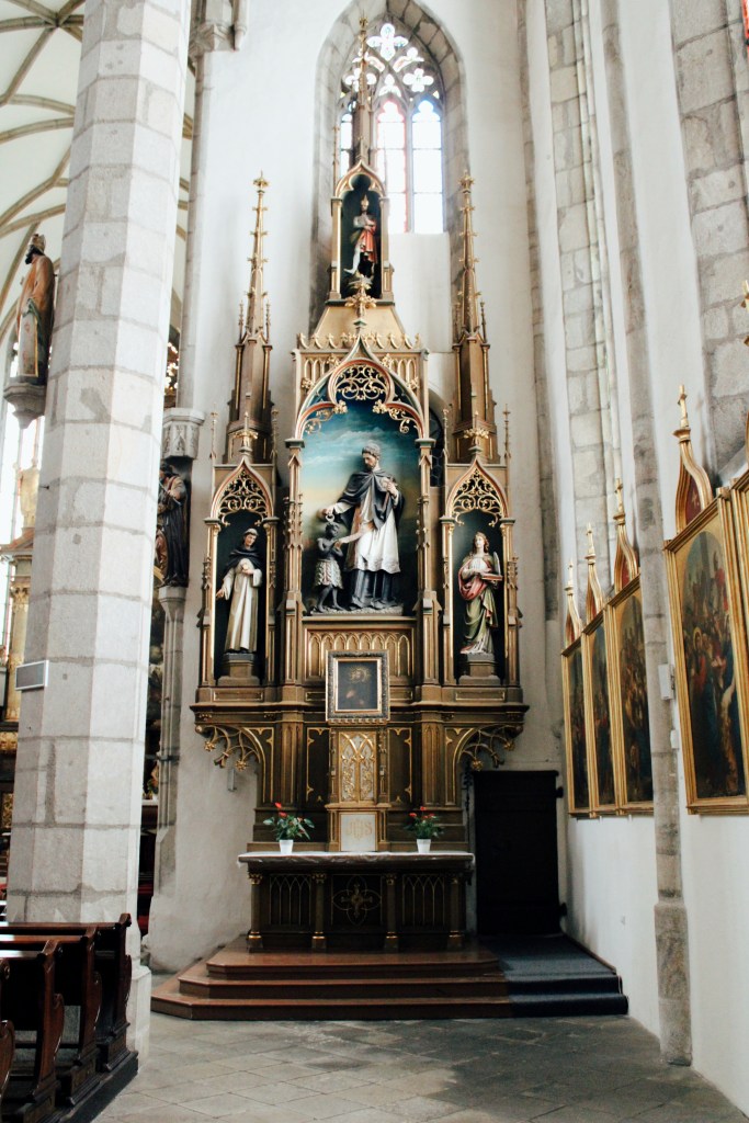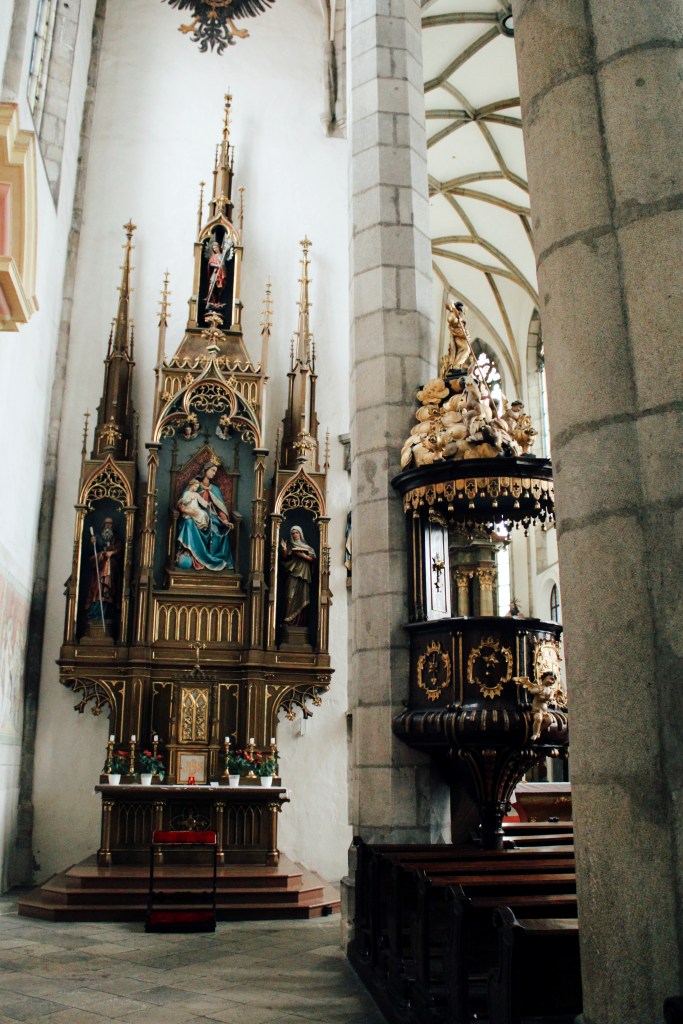 The Church of St. Vitus was built during the 15th century and it’s been designed in gothic style and with its three parallel naves, it is the most immense church in Český Krumlov. The top floor of the church was built 400 years later, in the 19th century and thus, it is also designed in the pseudogothic style.