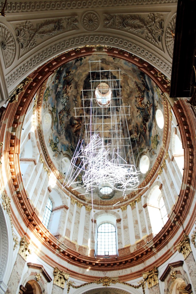 Moreover, the interior of this church will truly surprise you. Not just by its historical decorations and paintings, but also by the modern art, that at first glance seems almost too daring to shatter the decorations of the church’s ceiling, but after a longer look, it becomes something so perfectly integrated into the interior of the church, you most probably won’t fancy seeing this church without it anymore.